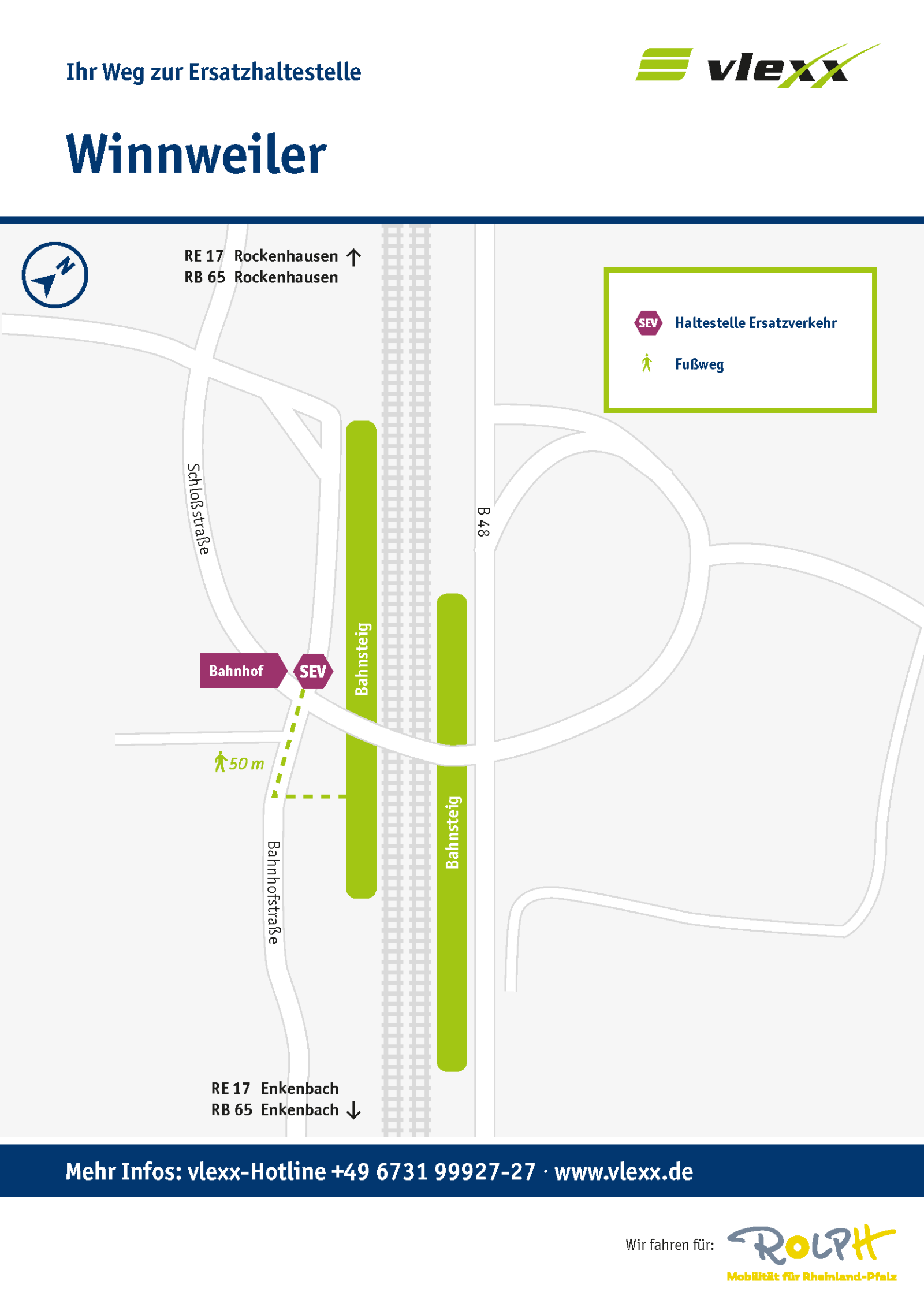Zwischen zwischen Kaiserslautern und Bad Münster am Stein bzw. zwischen Bingen und Koblenz kommt es zu Zugausfällen. Ein Schienenersatzverkehr (SEV) ist eingerichtet. Im Zeitraum vom 29. März bis 10. April fällt der RE 17 auf dem gesamten Laufweg.