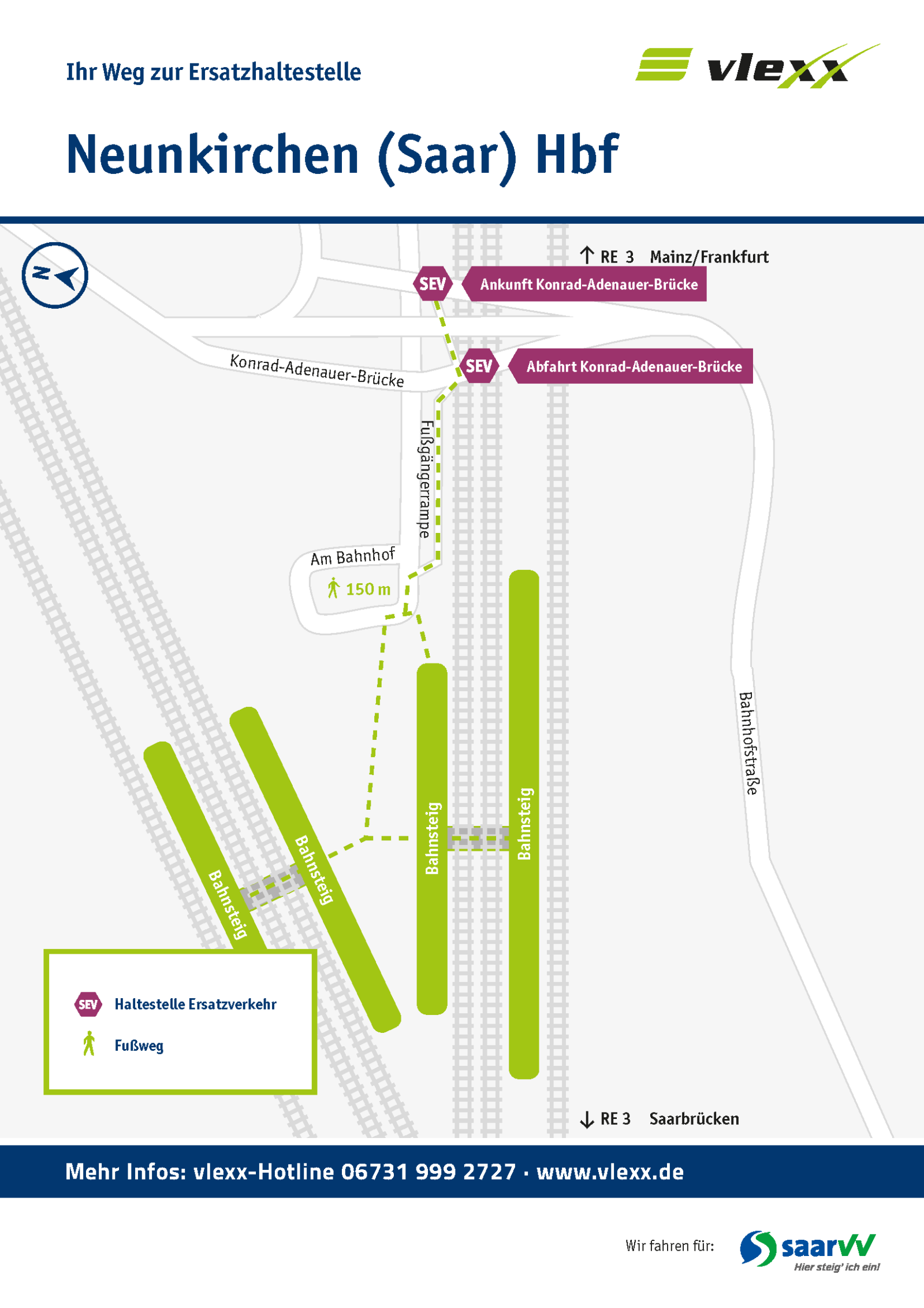 Die RB 76 mit Abfahrt um 01:25 Uhr ab Saarbrücken entfällt. Für die ausfallenden Halte ein Schienenersatzverkehr (SEV) eingerichtet.