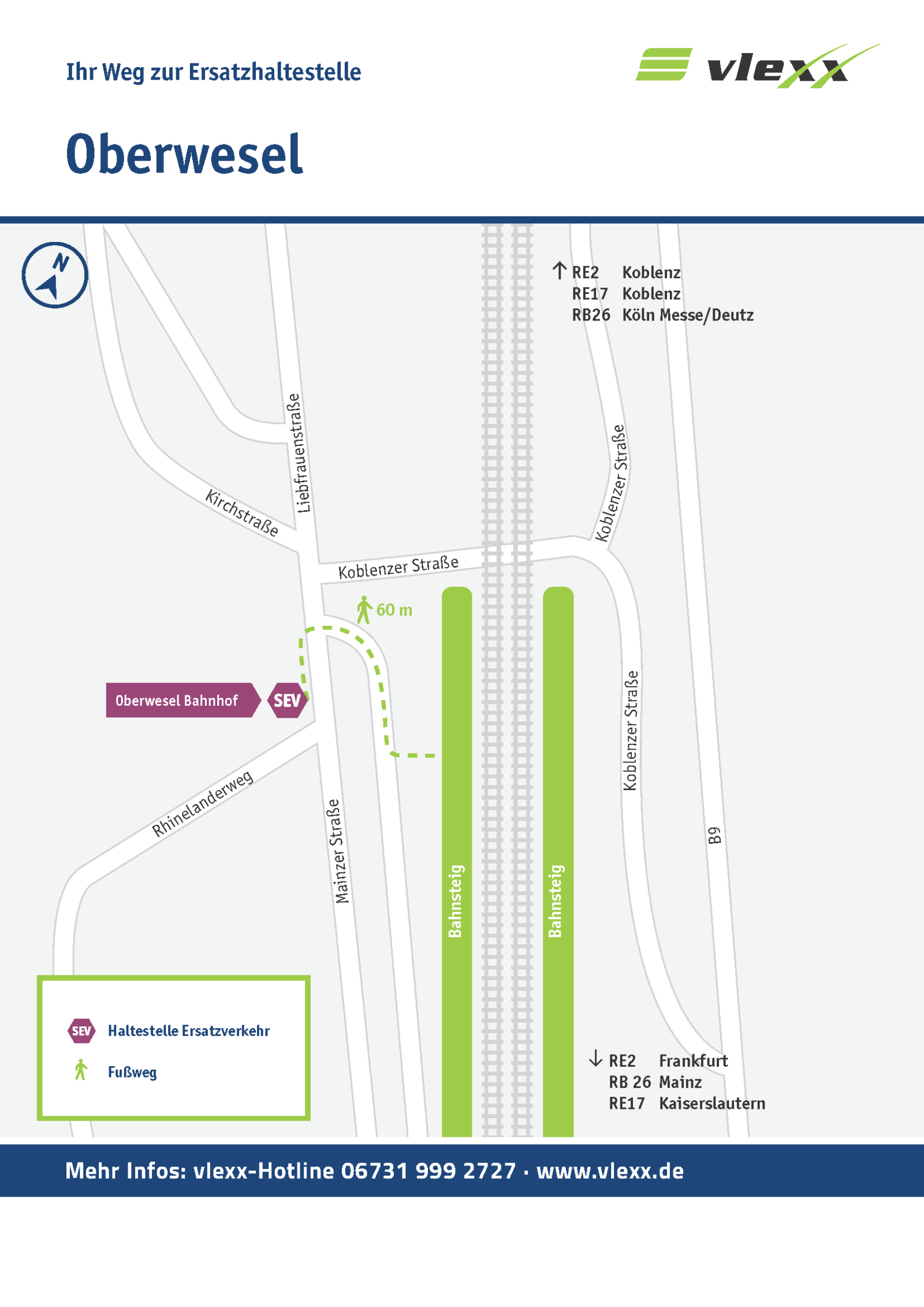 Ein SEV zwischen Boppard und Oberwesel ist eingerichtet. Die übrigen Halte zwischen Koblenz und Boppard werden von der RB 26 bedient.